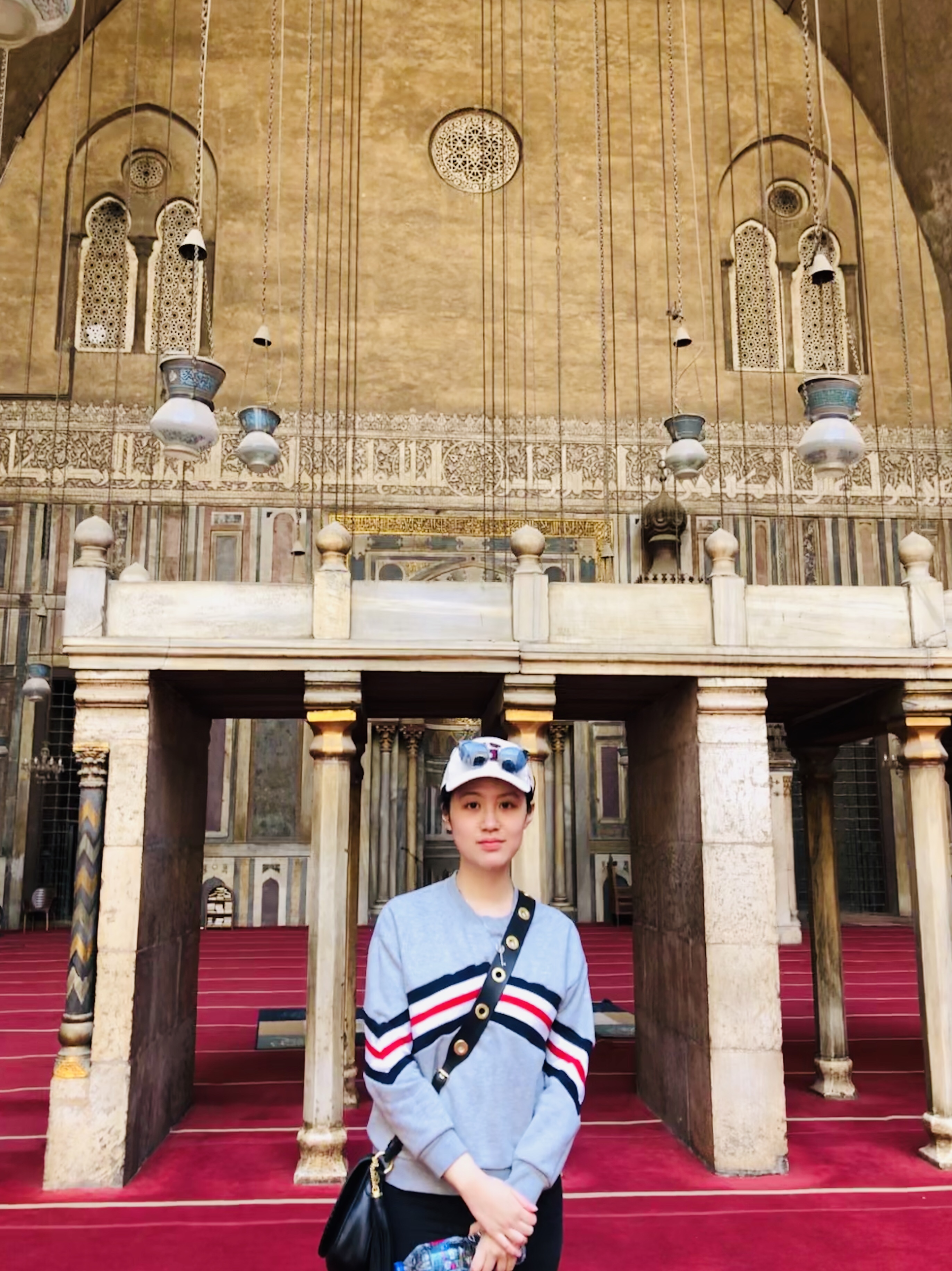 The guide points out the famous El Fishawy CafΓ© β Perhaps the most famous cafΓ© of the Arab world, he says. Lazy, hooded eyes stare at me through the veil of vapors from the shishas. I watch myself β slightly tanner, wearing a white “H” hat, eyes shining from under the visor β in the giant mirrors that decorate the exterior of the cafΓ© on both sides of the alley. This was where the Nobel Prize-winning writer Naguib Mahfouz wrote frequently (also apparently the setting of Midaq Alley). I picture myself writing here for a moment, surrounded by battered mirror frames, bubbling water pipes, and fresh glasses of mint tea. The promise is so great that I can almost taste it, like apricots with tobacco on my tongue. The thought dissipates when we emerge from under the archway, the swirls of smoke behind us.