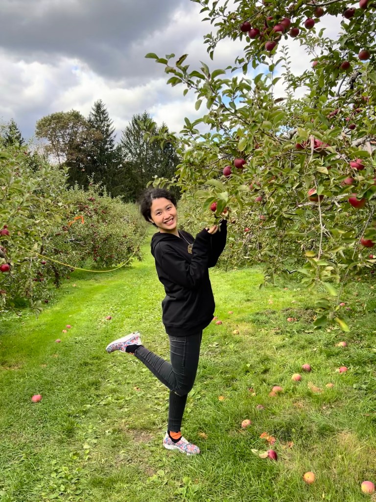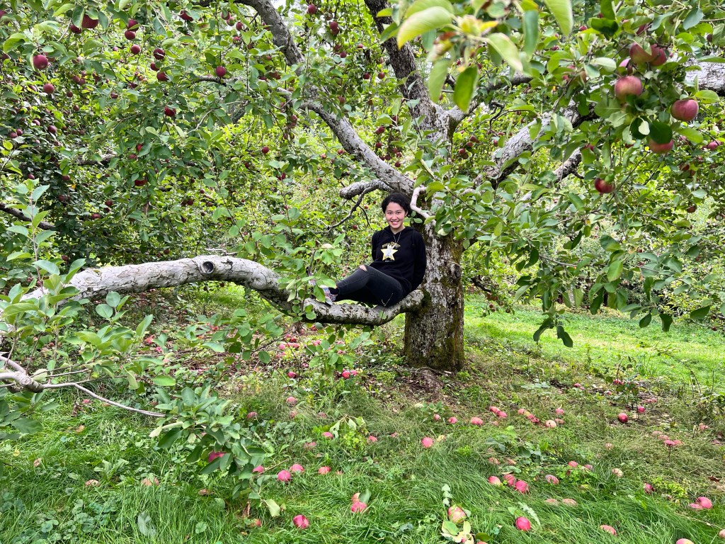 Climbing on ladders and branches with Emily to reach for round, cute, red, green apples. Munching on cider donuts with cinnamon painting my cold-flushed cheeks. Lugging an entire apple pie around a ginormous orchard, opening it with a flourish back in the dorm only to see that it has become apple crumble. Finishing our way through a bag of hand-picked apples for the rest of the month.
