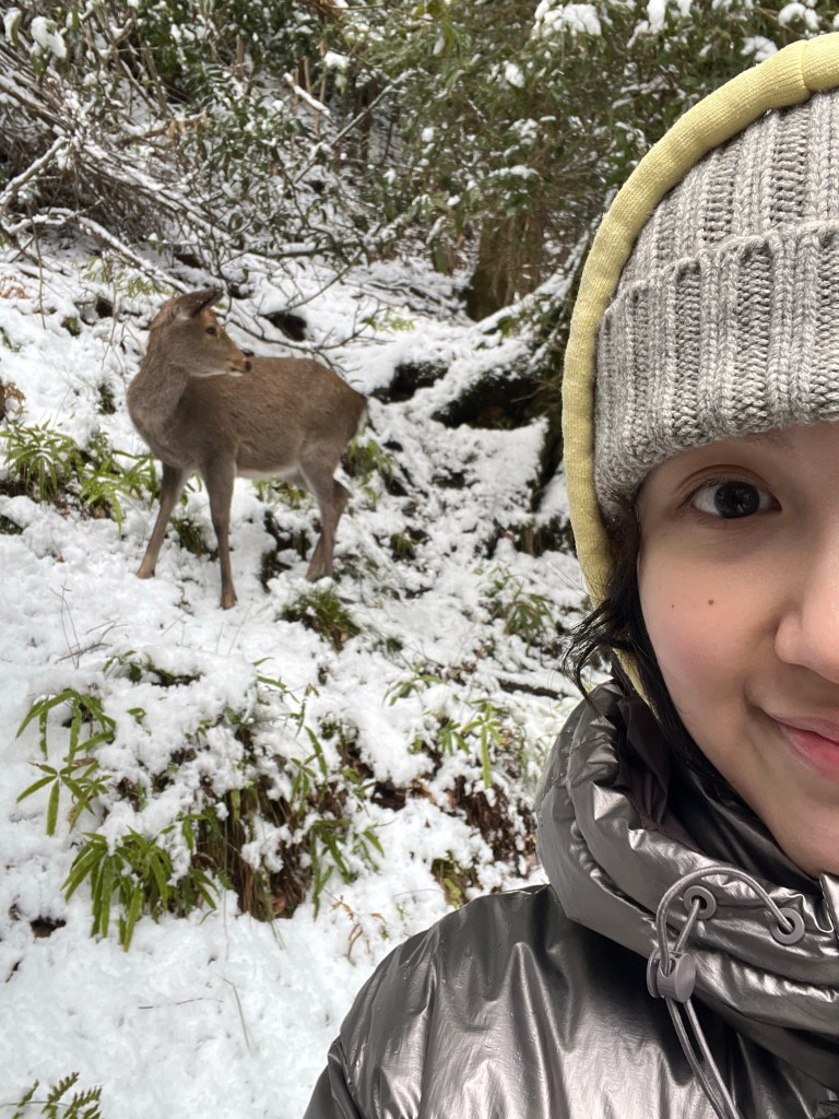 I go to temple after temple but somehow each is different. There’s the Kurama-dera, nestled high up in the mountains. At its foot, soft snow starts falling, flying into my hood, landing cold on my face, numbing my lips. By the time we start climbing, the whole mountain is a land of whiteness, snowcapped branches looking like a scene from right out of Frozen. I climb each step leaning heavy on the walking stick. How long more? I wonder. Just endless blankets of snow. Suddenly a rustle on my left. I turn. A deer nuzzling at the snow-covered ground, then behind it in the bushes, another. I want to gasp but instead marvel in silence, scared to disturb them. There’s no other sound other than the fall of snow and my breathing.